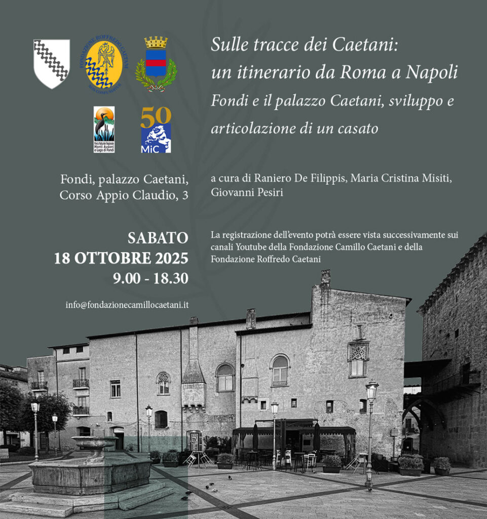 Il convegno ha l’obiettivo di mettere in luce alcuni aspetti dellapresenza della famiglia Caetani tra Roma e Napoli al fine di gettarele basi per la costruzione di un percorso storico-culturale permanente, una “Via dei Caetani” tra le due città. Al culmine diuna plurisecolare vicenda storica, in cui svolse un ruolo centrale l’abilità politica di papa Bonifacio VIII, i Caetani arrivarono a controllare buona parte della Marittima pontificia e dell’Alta Terra di Lavoro, dominando su territori che si estendevano da Roma a Napoli. Palazzi, giardini, monasteri, conventi, ospedali, chiese, porte d’accesso alle città, mura e bastioni, opere di bonifica idraulica, strade e piazze spuntarono in diverse città e paesi: un grande susseguirsi di opere pubbliche e private, spesso progettate, disegnate e realizzate da importanti architetti e artisti dell’epoca. Nel palazzo di Fondi, Onorato I ospitò il conclave che il 20 settembre 1378 elesse l’antipapa Clemente VII. Nello stesso palazzo il pontefice e la sua corte soggiornarono fino al maggio del 1379. Il registro Coquina, elenco di prodotti alimentari acquistati quotidianamente dal chierico addetto alla dispensa dell’antipapa, documenta anche l’alta potenzialità del territorio e la fitta rete di relazioni coltivata dalla famiglia Caetani. L’edizione del registro Coquina, curata da Maria Teresa Caciorgna, verrà presentata entro la metà di novembre presso il palazzo Caetani di Roma. La propensione per il bello e l’arte ha lasciato tracce ben visibili a Roma, Napoli e nel territorio oggi compreso nel Basso Lazio e nell’Alta Campania pressoché costellato di rocche, palazzi, castelli, monumenti e opere d’arte pittorica e scultoria dovuti alla magnificenza dei Caetani. Spesso si tratta di opere ubicate lungo il percorso dell’antica Via Appia, dichiarata dall’UNESCO patrimonio dell’umanità, e in aree di particolare valore naturalistico, paesaggistico e archeologico, oggetto di tutela da parte delle istituzioni regionali e statali. L’esigenza di provare a delineare prospettive e bilanci di valorizzazione del patrimonio architettonico, archeologico, culturale e naturalistico tra Roma e Napoli è quanto mai attuale e necessaria, sia in vista delle opportunità in questo settore offerte dal PNRR, sia perché la ripresa del turismo culturale si presta in modo particolare a favorire la scoperta e la riscoperta di luoghi e storie del passato. Nell’arco di una giornata, docenti e studiosi di fama internazionale, specialisti di varie discipline interverranno con letture frontali di circa 30 minuti ciascuna, integrate da immagini, registrazioni e dibattiti. Il convegno, per il quale è stato richiesto il contributo al Ministero della Cultura, si terrà nella sede del Palazzo Caetani a Fondi (LT), gentilmente messo a disposizione dall’Ente Parco regionale Monti Ausoni e Lago di Fondi.
